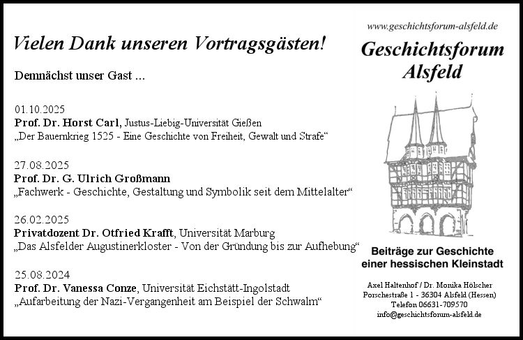 Geschichtsforum Alsfeld, Stadtarchiv, Stadtmuseum, Vereine, Hessische Staatsarchive, Magistrat, Ortsvorsteher, benachbarte Geschichtsvereine, …